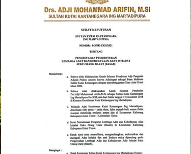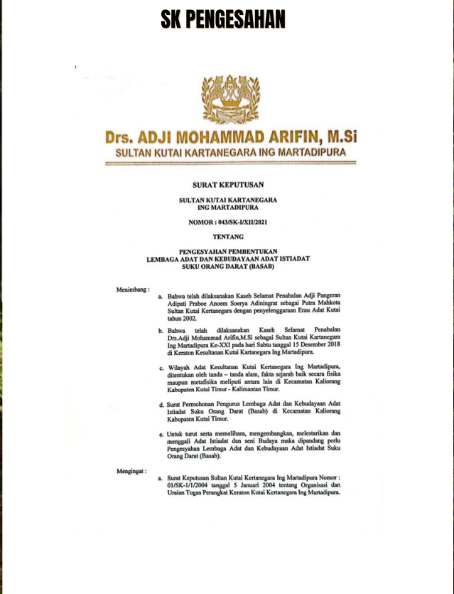 SK Pengesahan : SK Sultan Kutai Kartanegara Ing Martadipura ke-XX Nomor: 043/SK-1/XII/2021